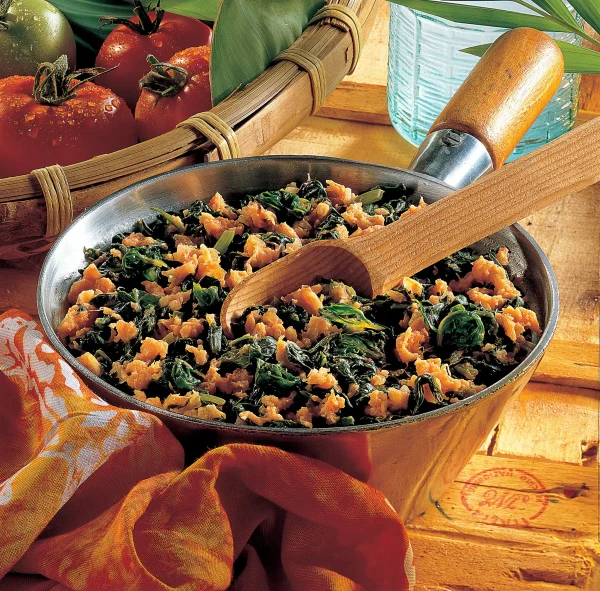 Frischer Blattspinat wird mit zarten Krabben und aromatischen Gewürzen in der Pfanne geschwenkt. Eine leichte, aber raffinierte Mahlzeit mit exotischem Flair.