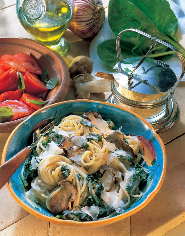 Eine cremige Pasta-Kreation mit zarten Pilzen, frischem Blattspinat und einer würzigen Sauce. Das Zusammenspiel aus herzhaften Aromen und feiner Cremigkeit macht dieses Gericht zu einer schnellen und köstlichen Mahlzeit.