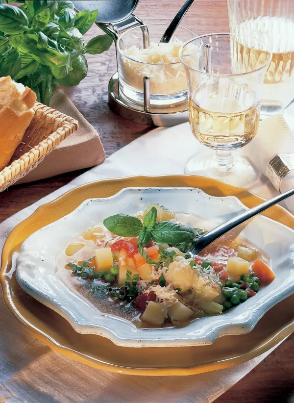 Ein herzhafter Gemüseeintopf voller Geschmack: Frische Zutaten wie Zwiebeln, Bohnen und Karotten sorgen für eine nahrhafte Suppe, die mit Parmesan oder Brot serviert werden kann. Ein Klassiker der italienischen Küche.