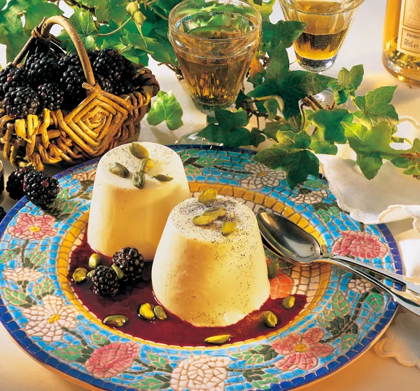 Klassische italienische Panna Cotta mit samtigem Brombeerpüree – eine perfekte Balance aus cremiger Süße und fruchtiger Säure. Ein elegantes Dessert für besondere Anlässe.