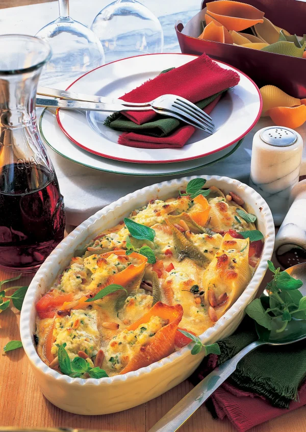 Mit würziger Füllung überbackene Muschelnudeln, verfeinert mit gerösteten Pinienkernen und cremiger Sauce. Ein mediterraner Genuss, der sich gut vorbereiten lässt.