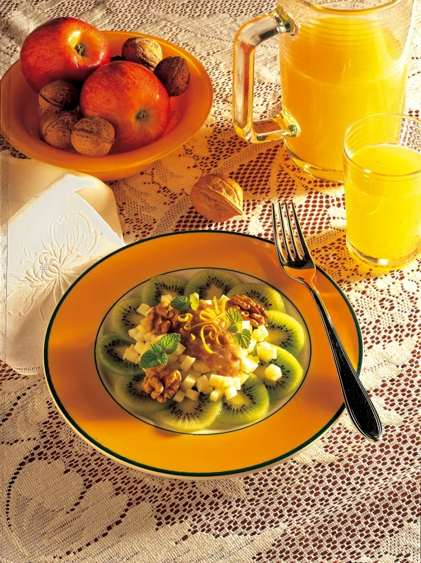 Fruchtig und frisch, mit einer aromatischen Walnuß-Sauce verfeinert, bietet sich dieser neuseeländische Obstsalat auch für eine größere Anzahl von Gästen an, denn er ist im Nu zubereitet