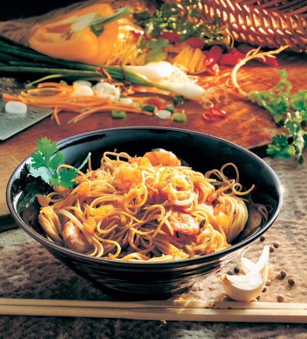 Dieses aromatische Wokgericht entführt Sie in die aufregende Welt der südostasiatischen Küche. Die Singapur Garnelen Nudeln vereinen feine Eiernudeln mit saftigen Garnelen, knackigem Gemüse und einer harmonischen Würzung aus Ingwer, Chili und Sojasauce. Die dezente Schärfe und die asiatischen Aromen machen dieses Gericht zu einem echten Geschmackserlebnis. Abgerundet mit frischen Sojasprossen und Koriander entsteht eine…